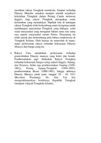 bersama. Berkembangnya faham kebebasan bagi rakyat pemerintahan Dinasty mansyu yang kolot dan lemah.