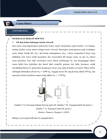 Gambar 7.3a. Penerapan hukum Newton pada lift. Gambar 7.3b. Tegangan kabel lift massa 1.