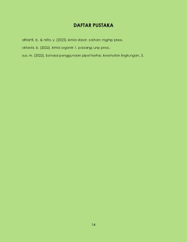 DAFTAR PUSTAKA afrianti, d., & mita, y. (2023). kimia dasar. painan: mgmp press. oktavia, b. (2022). kimia organik 1. padang: unp press. yus, m. (2022). bahasa penggunaan pipet kertas. kesehatan lingkungan, 3. 14