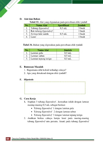 Tabel 33. Alat yang digunakan pada percobaan efek tyndall