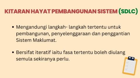 KITARAN HAYAT PEMBANGUNAN SISTEM (SDLC) Mengandungi langkah- langkah tertentu untuk pembangunan, penyelenggaraan dan penggantian Sistem Maklumat. Bersifat iteratif iaitu fasa tertentu boleh diulang semula sekiranya perlu.