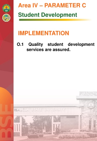 Area IV – PARAMETER C Student Development IMPLEMENTATION O.1 Quality student development services are assured.