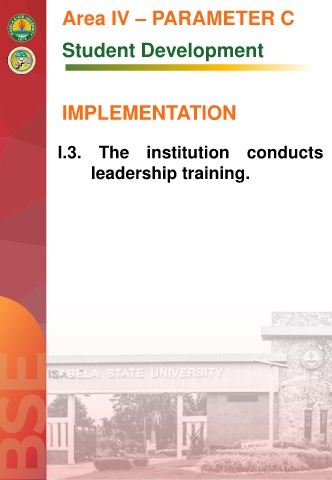 Area IV – PARAMETER C Student Development IMPLEMENTATION I.3. The institution conducts leadership training.