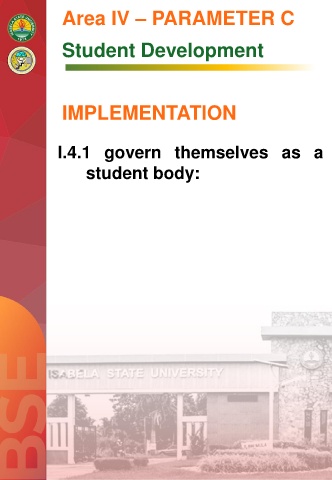 Area IV – PARAMETER C Student Development IMPLEMENTATION I.4.1 govern themselves as a student body: