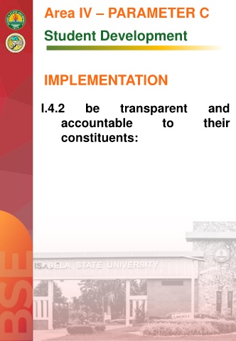 Area IV – PARAMETER C Student Development IMPLEMENTATION I.4.2 be transparent and accountable to their constituents: