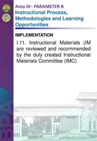 Area III– PARAMETER B Instructional Process, Methodologies and Learning Opportunities IMPLEMENTATION I.11. Instructional Materials (IM are reviewed and recommended by the duly created Instructional Materials Committee (IMC)