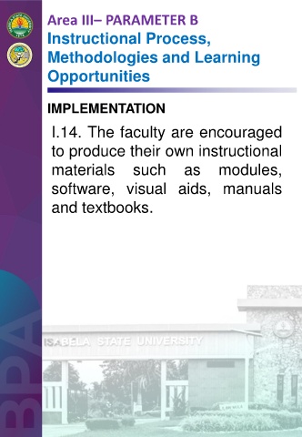 Area III– PARAMETER B Instructional Process, Methodologies and Learning Opportunities IMPLEMENTATION I.14. The faculty are encouraged to produce their own instructional materials such as modules, software, visual aids, manuals and textbooks.
