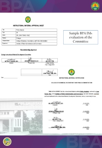 Sample BPA IMs evaluation of the Committee