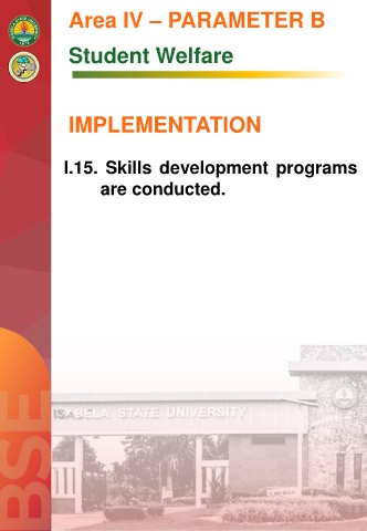 Area IV – PARAMETER B Student Welfare IMPLEMENTATION I.15. Skills development programs are conducted.