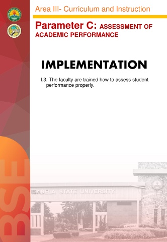 Area III- Curriculum and Instruction Parameter C: ASSESSMENT OF ACADEMIC PERFORMANCE IMPLEMENTATION I.3. The faculty are trained how to assess student performance properly.