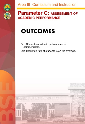Area III- Curriculum and Instruction Parameter C: ASSESSMENT OF ACADEMIC PERFORMANCE OUTCOMES O.1. Student’s academic performance is commendable. O.2. Retention rate of students is on the average.