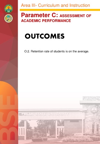 Area III- Curriculum and Instruction Parameter C: ASSESSMENT OF ACADEMIC PERFORMANCE OUTCOMES O.2. Retention rate of students is on the average.