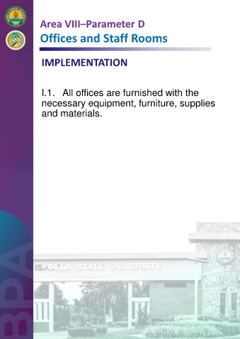 Area VIII–Parameter D Offices and Staff Rooms IMPLEMENTATION I.1. All offices are furnished with the necessary equipment, furniture, supplies and materials.