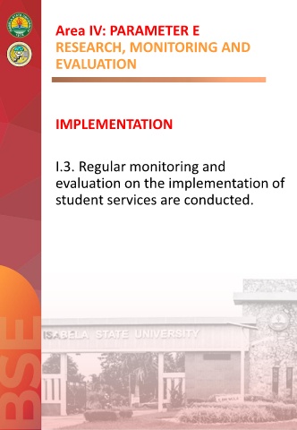 Area IV: PARAMETER E RESEARCH, MONITORING AND EVALUATION IMPLEMENTATION I.3. Regular monitoring and evaluation on the implementation of student services are conducted.