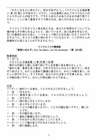 ナイジェリアのキリスト者女性たちは、あなたが世界のどこにいても、 魂の安らぎが得られるようにと、招いています。共に礼拝を守るとき、 互いの重荷を分かちあい、一つとなって新たな力を見いだすことができ ますように。キリストの愛に抱かれて一つになるとき、ここがわたしの 居場所だと信じることができますように。