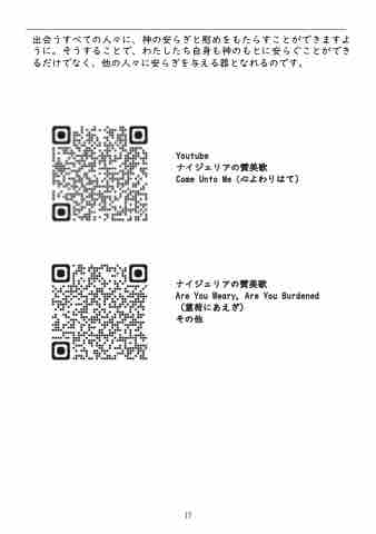 出会うすべての人々に、神の安らぎと慰めをもたらすことができますよ うに。そうすることで、わたしたち自身も神のもとに安らぐことができ るだけでなく、他の人々に安らぎを与える器となれるのです。 Youtube ナイジェリアの賛美歌 Come Unto Me(心よわりはて) ナイジェリアの賛美歌 Are You Weary, Are You Burdened (菫荷にあえぎ) その他 1717
