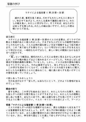 教えと奇跡のあとに語られました。さまざまな人びとからの疑問や批判に さらされながらも、イエスは神の国を新しい方法で理解するよう招き続け ます。この「来て安らぎを得なさい」という呼びかけと安らぎを与えると いう呼びかけは、一時的なものではなく、新しい神との関係における生き