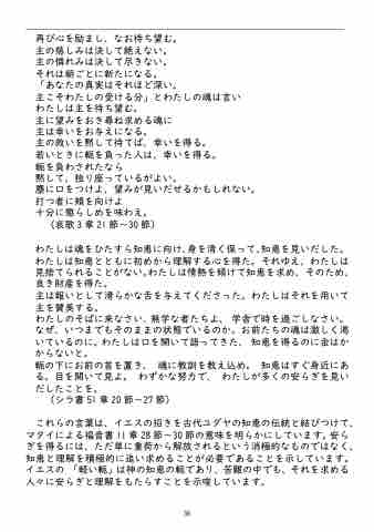 これらの言葉は、イエスの招きを古代ユダヤの知恵の伝統と結びつけて、 マタイによる福音書 11 章 28 節~30 節の意味を明らかにしています。安ら ぎを得るには、ただ単に重荷から解放されるという消極的なものではなく、 知恵と理解を積極的に追い求めることが必要であることを示しています。 イエスの 「軽い軛」は神の知恵の軛であり、苦難の中でも、それを求める 人々に安らぎと理解をもたらすことを示唆しています。