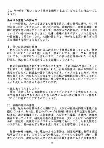 初めに神は創造されたすべてのものを見て、「それは極めて良かった」と 言われました(創世記 1 章 31 節)。わたしたちの価値は、他人の評価から 来るのではなく、創造主の愛から来るのです。イエスのもとに来て、その 軛を負うとき、わたしたちを悩ませてきた低い価値観を取り除くことがで きるのです。わたしたちの信仰は、神に愛される子としてのアイデンティ ティを受け入れる自由を与えてくれます。