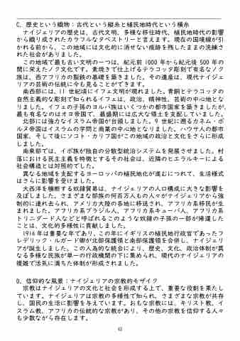 C.歴史という織物:古代という縦糸と植民地時代という横糸 ナイジェリアの歴史は、古代文明、多様な移住時代、植民地時代の影響 から織り成されたカラフルなタペストリーと言えます。現在の国境線が引 かれる前から、この地域には文化的に消せない痕跡を残したままの洗練さ