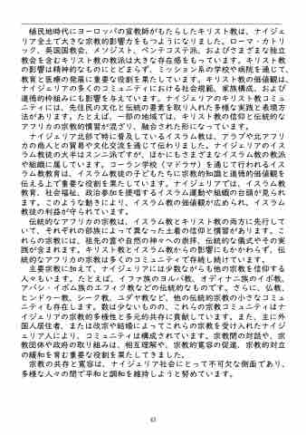 主要宗教に加えて、ナイジェリアには少数ながらも他の宗教を信仰する 人々もいます。たとえば、イファ族のヨルバ教、オディナニ族のイボ教、 アバシ・イボム族のエフィク教などの伝統的なものです。さらに、仏教、 ヒンドゥー教、シーク教、ユダヤ教など、他の伝統的宗教の小さなコミュ ニティも存在します。数は少ないものの、これらの宗教コミュニティはナ イジェリアの宗教的多様性と多元的共存に貢献しています。また、主に外 国人居住者、または改宗や結婚によってこれらの宗教を受け入れたナイジ ェリア人により、コミュニティは構成されています。宗教間の対話や、宗 教団体や政府の取り組みは、相互理解や、宗教的寛容の促進、宗教的対立 の緩和を育む重要な役割を果たしてきました。