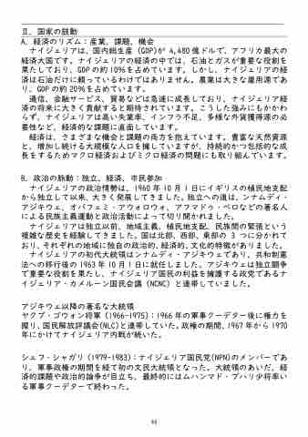 通信、金融サービス、貿易などは急速に成長しており、ナイジェリア経 済の将来に大きく貢献すると期待されています。こうした強みにもかかわ らず、ナイジェリアは高い失業率、インフラ不足、多様な外貨獲得源の必 要性など、経済的な課題に直面しています。