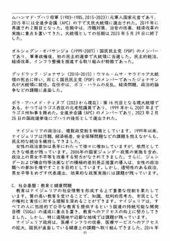 います。質の高い教育を受けることで、知識、批判的思考力、市民として の権利と責任に対する理解を深めることができます。ナイジェリアは、す べての人に包括的で公平な教育を提供するという国連の持続可能な開発 目標(SDGs)の達成に重点を置き、教育へのアクセスの向上に努力してき ました。しかし、特に遠隔地や辺鄙な地域では課題が残っています。