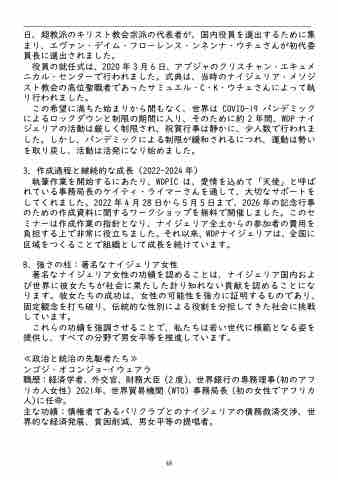 れている事務局長のケイティ・ライマーさんを通して、大切なサポートを してくれました。2022 年 4 月 28 日から 5 月 5 日まで、2026 年の記念行事 のための作成資料に関するワークショップを無料で開催しました。このセ ミナーは作成作業の指針となり、ナイジェリア全土からの参加者の費用を 負担する上で非常に役立ちました。それ以来、WDPナイジェリアは、全国に 区域をつくることで組織として成長を続けています。