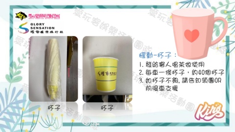 耀動-杯子: 1.發給客人喝茶做使用 2.每車一條杯子,約40個杯子 3.如杯子不夠,請告知領團OR 前後車支援 杯子 杯子