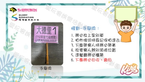 耀動-手舉牌: 1.務必放上里別單 2.拍布條照時要記得拍進去 3.下車帶客人時務必帶著 4.放便客人辨別領隊位置 5.進餐廳務必攜帶 6.下團務必回收、繳回 手舉牌