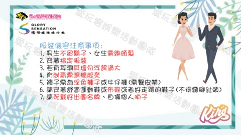 服裝儀容注意事項: 1.男生不留鬍子、女生需綁頭髮 2.穿著指定服裝 3.若有耳洞耳環勿浮誇過大 4.有刺青需遮擋起來 5.褲子需為深色褲子或牛仔褲(需繫皮帶) 6.請穿著舒適運動鞋或布鞋或者好走路的鞋子(不得露腳趾頭) 7.請配戴好出團名牌、自備個人哨子