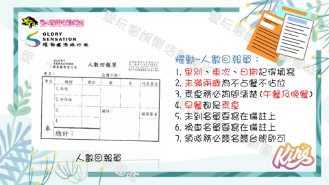 耀動-人數回報單: 1.里別、車次、日期記得填寫 2.未滿兩歲為不占餐不佔位 3.素食務必詢問清楚(午餐及晚餐) 4.早餐都是素食 5.未到名單要寫在備註上 6.換車名單要寫在備註上 7.領隊務必簽名簽台號即可 人數回報單