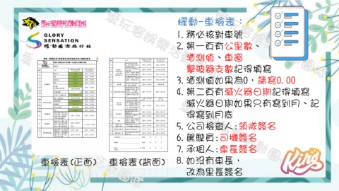 耀動-車檢表: 1.務必核對車號 2.第一頁有公里數、 酒測值、車窗 擊破器支數記得填寫 3.酒測值如果為0,請寫0.00 4.第二頁有滅火器日期記得填寫 滅火器日期如果只有寫到月、記 得寫到月底 5.公司檢查人:領隊簽名 6.駕駛員:司機簽名 7.承租人:車長簽名 車檢表(正面) 車檢表(背面) 8.如沒有車長, 改為里長簽名
