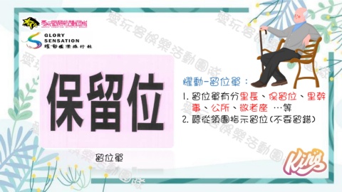 耀動-留位單: 1.留位單有分里長、保留位、里幹 事、公所、敬老座 …等 2.聽從領團指示留位(不要留錯) 留位單