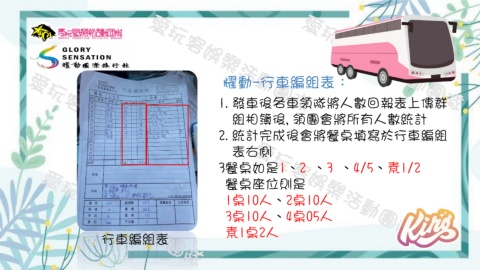 耀動-行車編組表: 1.發車後各車領隊將人數回報表上傳群 組相簿後,領團會將所有人數統計 2.統計完成後會將餐桌填寫於行車編組 表右側 3餐桌如是1、2 、3 、4/5、素1/2 餐桌座位則是 1桌10人、2桌10人 3桌10人、4桌05人 素1桌2人 行車編組表
