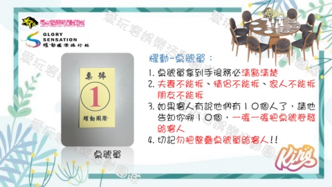 耀動-桌號單: 1.桌號單拿到手後務必清點清楚 2.夫妻不能拆、情侶不能拆、家人不能拆 朋友不能拆 3.如果客人有說他們有10個人了,請他 告知你哪10個,一張一張把桌號卷發 給客人 4.切記勿把整疊桌號單給客人!! 桌號單