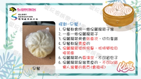 耀動-早餐: 1.早餐都會用一個保麗龍箱子裝 2.一車一個保麗龍箱子 3.保麗龍箱旁會貼車次,切勿拿錯 4.早餐都是素食的 5.保麗龍箱使用完畢,找時間放回 接領車 6.保麗龍箱內要清空,不可留包子 6.保麗龍箱是裝素食的,不可以給 早餐 客人裝葷的東西(會破戒)