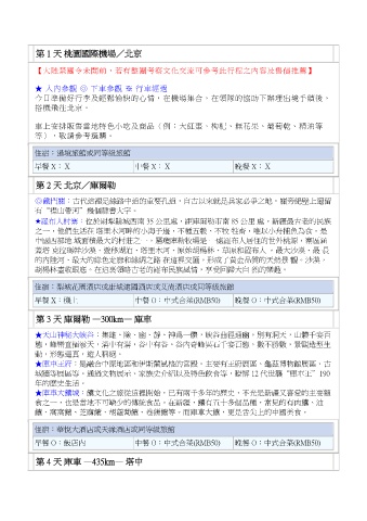 早餐 X:機上 中餐 O:中式合菜(RMB50) 晚餐 O:中式合菜(RMB50)