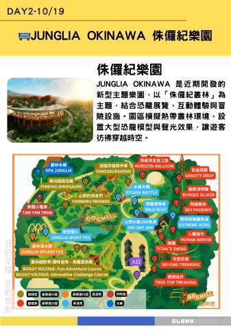DAY2-10/19 JUNGLIA OKINAWA 侏儸紀樂園 侏儸紀樂園 JUNGLIA OKINAWA 是近期開發的 新型主題樂園,以「侏儸紀叢林」為 主題,結合恐龍展覽、互動體驗與冒 險設施。園區模擬熱帶叢林環境,設 置大型恐龍模型與聲光效果,讓遊客 彷彿穿越時空。