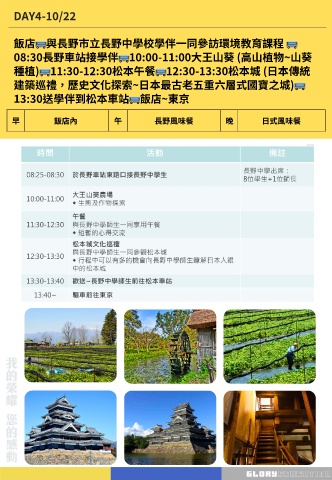 DAY4-10/22 飯店 與長野市立長野中學校學伴一同參訪環境教育課程 08:30長野車站接學伴 10:00-11:00大王山葵 (高山植物~山葵 種植) 11:30-12:30松本午餐 12:30-13:30松本城 (日本傳統 建築巡禮,歷史文化探索~日本最古老五重六層式國寶之城) 13:30送學伴到松本車站 飯店~東京 飯店內 早 午 ⻑野風味餐 晚 ⽇式風味餐