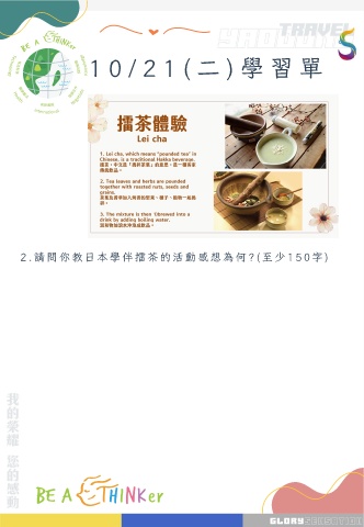 1 0 / 2 1 ( 二 ) 學 習 單 2 . 請 問 你 教 日 本 學 伴 擂 茶 的 活 動 感 想 為 何 ? ( 至 少 1 5 0 字 )
