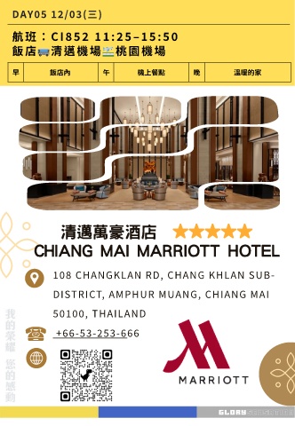 DAY05 12/03(三) 航班:CI 852 11: 25–15: 50 飯店 清邁機場 桃園機場 飯店內 早 午 機上餐點 晚 溫暖的家 清邁萬豪酒店 ⭐⭐⭐⭐⭐ CHIANG MAI MARRIOTT HOTEL 108 CHANGKLAN RD, CHANG KHLAN SUB- DISTRICT, AMPHUR MUANG, CHIANG MAI 50100, THAILAND +66-53-253-666