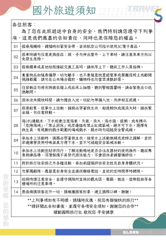 11 對於旅行社安排之外各種活動,參加前謹慎評估安全性及自身身體狀況。