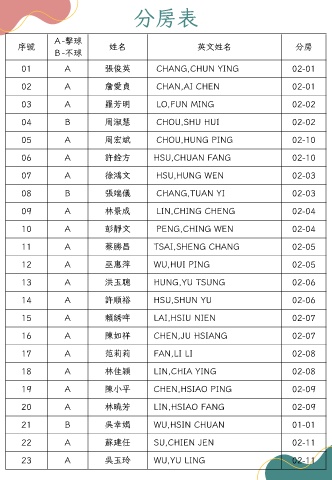序號 姓名 英文姓名 分房