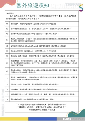 11 對於旅行社安排之外各種活動,參加前謹慎評估安全性及自身身體狀況。