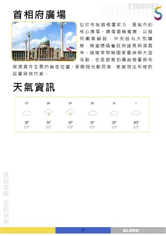 首 相 府 廣 場 位 於 布 城 首 相 署 前 方,是 城 市 的 核 心 廣 場 。 廣 場 面 積 寬 廣 , 以 幾 何 圖 案 鋪 設 , 中 央 設 有 大 型 噴 泉,周 圍 環 繞 着 政 府 建 築 與 清 真 寺。這 裡 常 舉 辦 國 家 慶 典 與 大 型 活 動,也 是 遊 客 拍 攝 首 相 署 與 布 城 清 真 寺 全 景 的 最 佳 位 置。夜 晚 燈 光 點 亮 後,更 展 現 出 布 城 的 莊 嚴 與 現 代 感 。 天 氣 資 訊 18