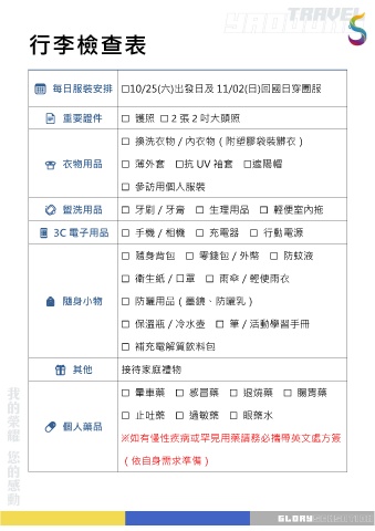 每日服裝安排 ☐10/25(六)出發日及 11/02(日)回國日穿團服