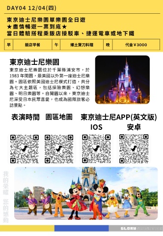 DAY04 12/04(四) 東京迪士尼樂園單樂園全日遊 ★ 盡情暢遊一票到底★ 當日體驗搭程乘飯店接駁車、捷運電車或地下鐵 代⾦¥3000 早 飯店早餐 午 鄉⼟寶⼑料理 晚 東京迪士尼樂園 東京迪士尼樂園位於千葉縣浦安市,於 1983 年開園,是美國以外第一座迪士尼樂 園。園區依照美國迪士尼模式打造,共分 為七大主題區,包括探險樂園、幻想樂 園、明日樂園等。自開園以來,東京迪士 尼深受日本民眾喜愛,也成為國際旅客必 訪景點。 表演時間 園區地圖 東京迪士尼APP(英文版) IOS 安卓