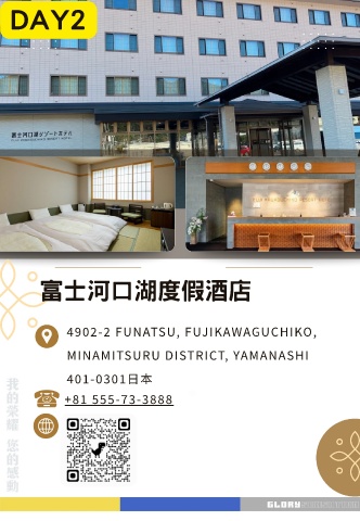 DAY2 富士河口湖度假酒店 4902-2 FUNATSU, FUJIKAWAGUCHIKO, MINAMITSURU DISTRICT, YAMANASHI 401-0301日本 +81 555-73-3888