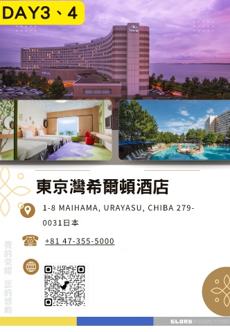 DAY3、4 東京灣希爾頓酒店 1-8 MAIHAMA, URAYASU, CHIBA 279- 0031日本 +81 47-355-5000